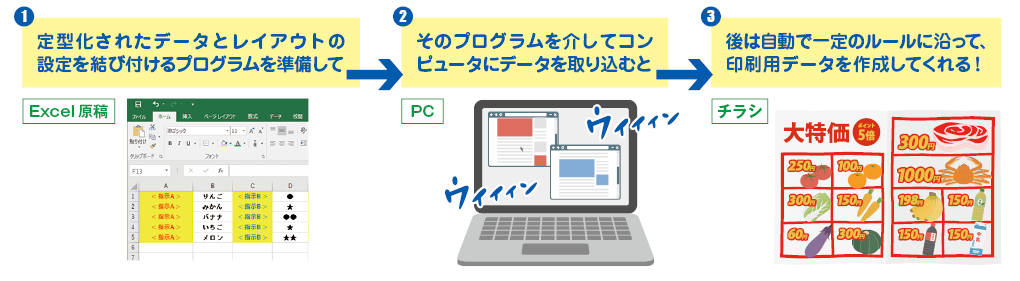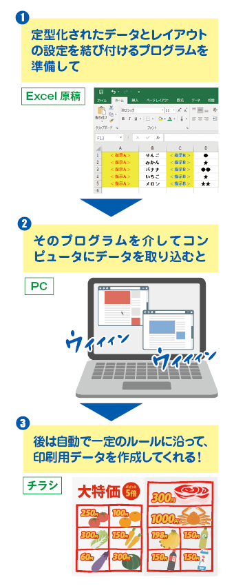 “自動組版”とは、あらかじめ設定したレイアウトテンプレートと、定型化されたデータを結びつけるプログラムを準備し、そのプログラムを介してデータを取り込み、決められたルールに沿って組版処理を進めていく手法です。