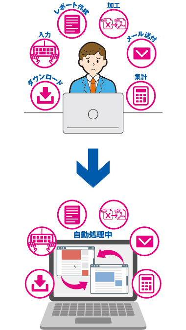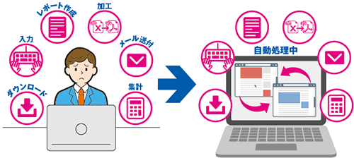 人が行っているパソコン作業を、ソフトに覚え込ませて自動で処理します。